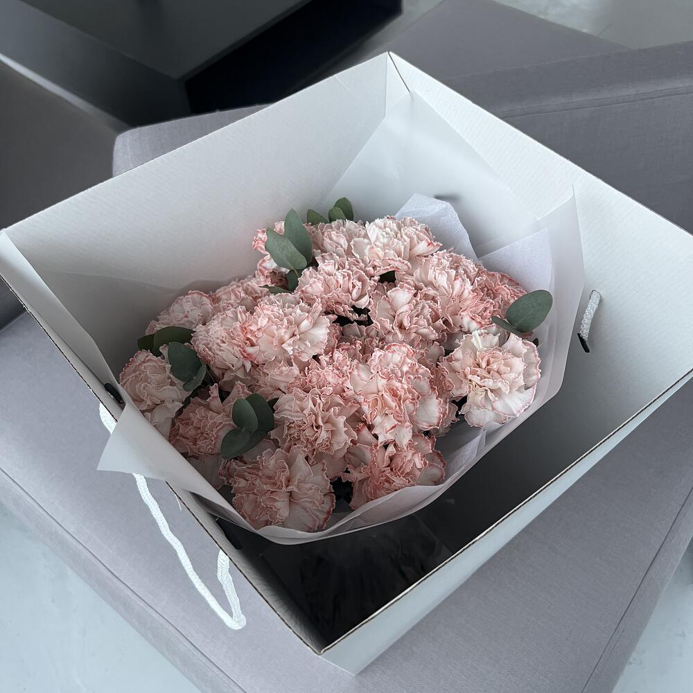 Букет из 25 стеблей нежно-розовой гвоздики с ароматным эвкалиптом в стильной полупрозрачной упаковке